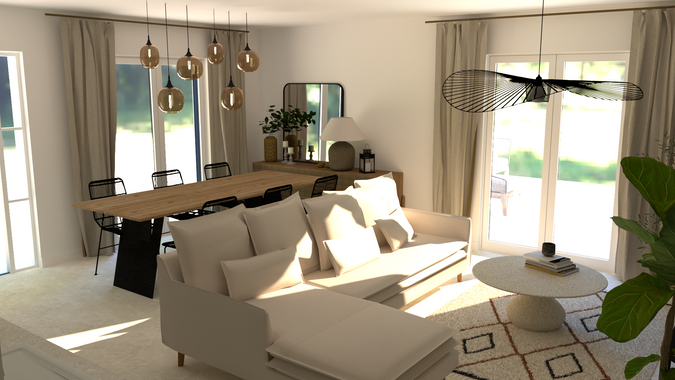 On retrouve donc un beau séjour décoré dans un style méditerranéen moderne qui allie les matières naturelles (pierre, bois, béton ciré clair, coton, lin... ) à quelques pièces plus industrielles en métal et une belle cuisine noire pour apporter de la modernité et du caractère. Dans les chambres une décoration simple, moderne et minimaliste où l'on retrouve là encore du bois, des teintes chaleureuses, et de beau tissu en fibre naturelle.